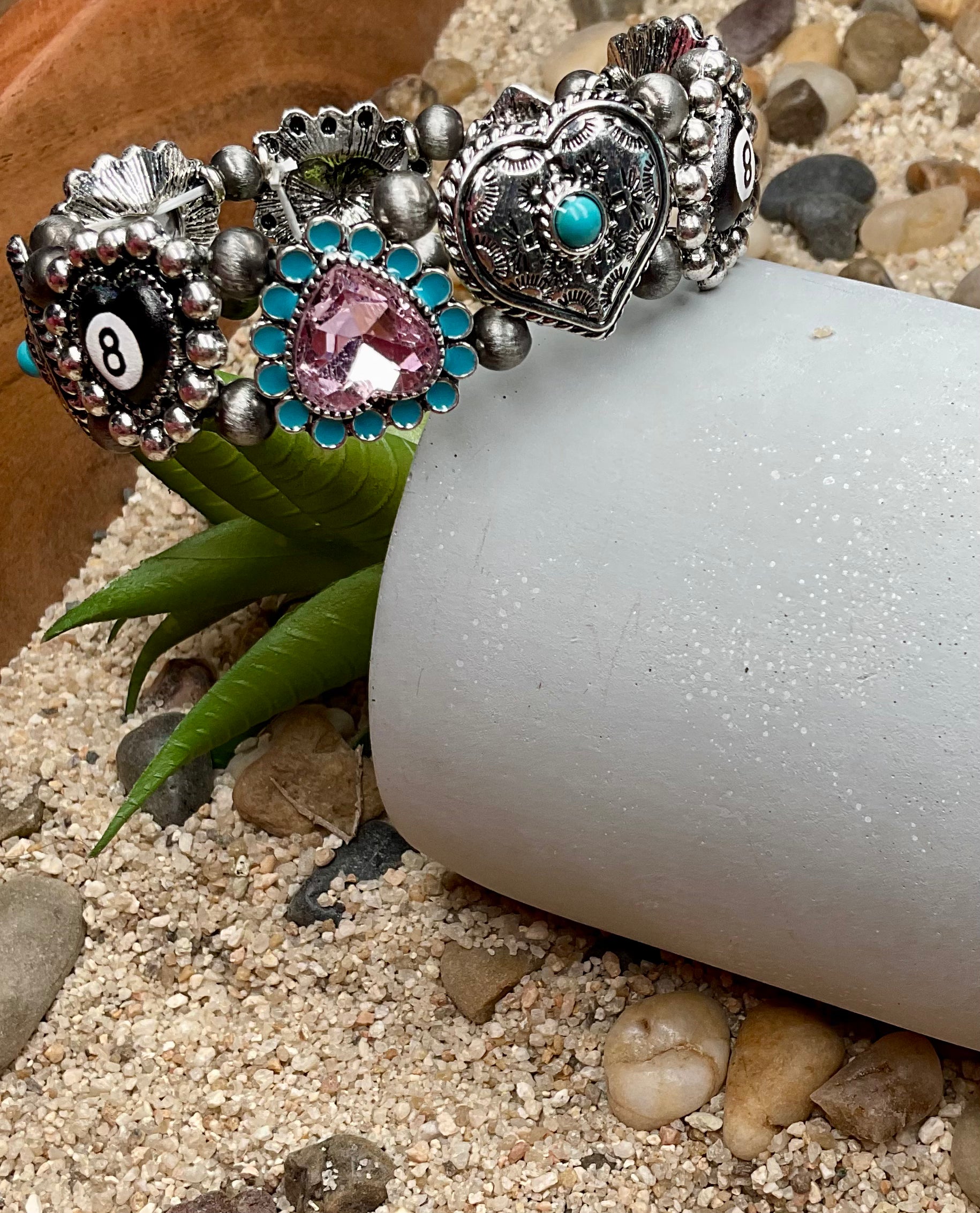 This eye-catching stretch bracelet features engraved silver conchos, a turquoise-accented heart charm, a sparkling pink crystal centerpiece, and a playful lucky “8” detail for that extra cowgirl attitude.
